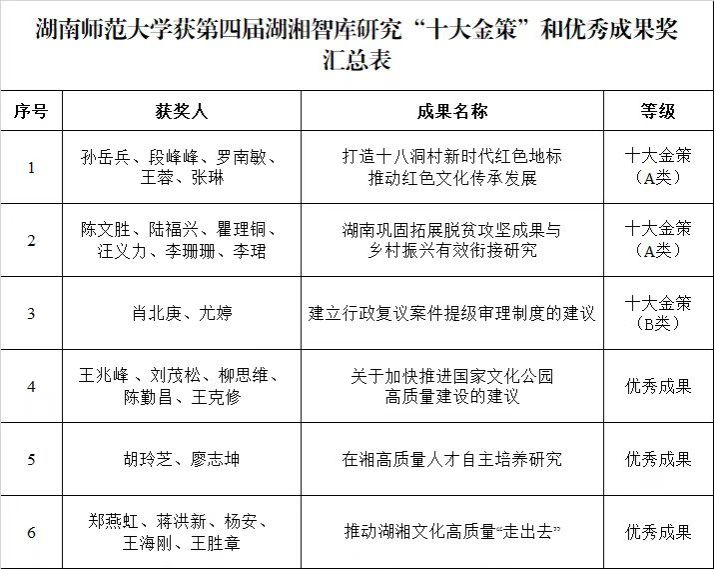 经单位推荐、资格审查、专家评审、网上公示等环节,共22项成果获评第四届湖湘智库研究“十大金策”,35项成果获评第四届湖湘智库研究优秀成果。我校2项成果获评第四届湖湘智库研究“十大金策”(A类);1项成果获评第四届湖湘智库研究“十大金策”(B类);3项成果获评第四届湖湘智库研究优秀成果,获奖总数位居全省首位。