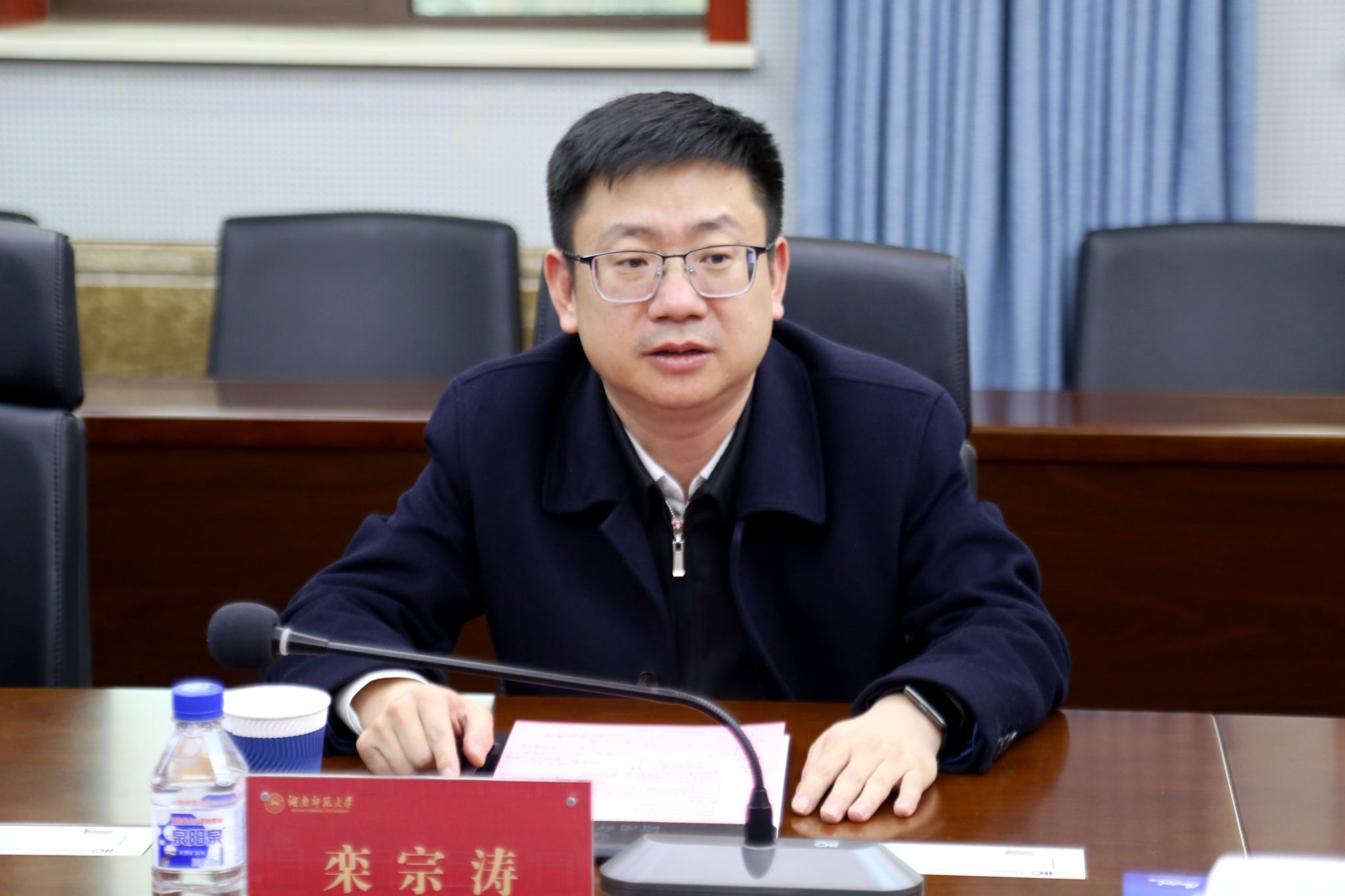 栾宗涛对我校的学科建设基础、学位建设情况和深厚的办学底蕴表示肯定。他对我校的学位与研究生教育工作提出三点要求:一是要加快推动传统学科转型。优化学科专业设置,朝着智能化现代化方向改造升级,深入研究学科发展前景,以创新驱动为导向,立足区域国别和国际传播,加快推动文、理、工科交叉融合发展,为全社会培养高质量人才;二是要在人文社科领域争一流。要进一步明确和拓展学科概念,紧跟时代技术发展,把标志性成果作为检验学科建设的标准,坚持“学以致用”的建设理念,与实践结合、与技术结合,发挥学校学科教育的特色和优势,切实推动成果落地见效;三要始终重视学科建设和学位点申报。面向2035年建成教育强国的目标,根据高等教育发展需求、湖南“三高四新”发展需求和国家重大战略需求,推进学位点建设,加强专业学位建设和专业人才培养,为学校后续发展奠定坚实的基础。