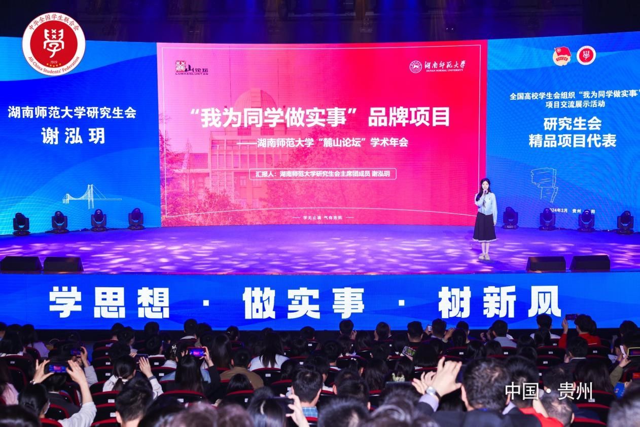 (通讯员 刘家玮 袁理 吴泓锟)3月21—24日,全国高校学生会组织“我为同学做实事”项目交流展示活动在贵阳举行。我校校学生会项目获评全国优秀项目,研究生会项目获评全国优秀项目、全国精品项目。研究生会项目作为全国四所高校代表之一、全国研究生会唯一、湖南省唯一项目与清华大学等高校在闭幕式上进行展示。