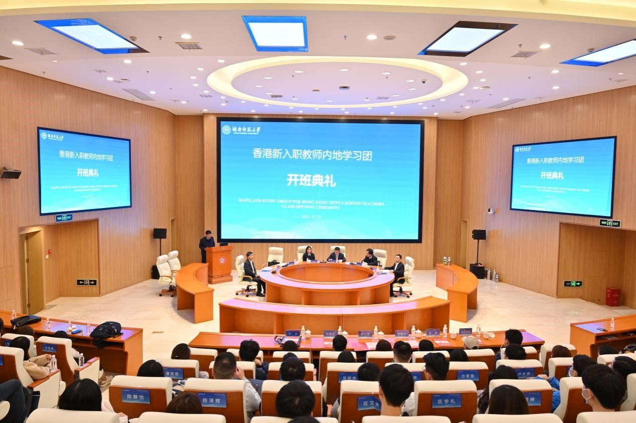 (供稿 教科院)3月25日下午,由中央人民政府驻香港特别行政区联络办公室、教育部和湖南省委宣传部、湖南省教育厅指导,香港特别行政区政府教育局主办,我校教育科学学院承办的“香港新入职教师内地学习团(长沙)第三期”(以下简称“学习团”)开班典礼在我校举行。香港特别行政区教育局学校领导及专业发展组高级专业发展主任罗嘉恩,省委教育工委委员、省教育厅党组成员朱正华,我校副校长唐贤清出席开班典礼。典礼由教育科学学院院长刘铁芳主持。