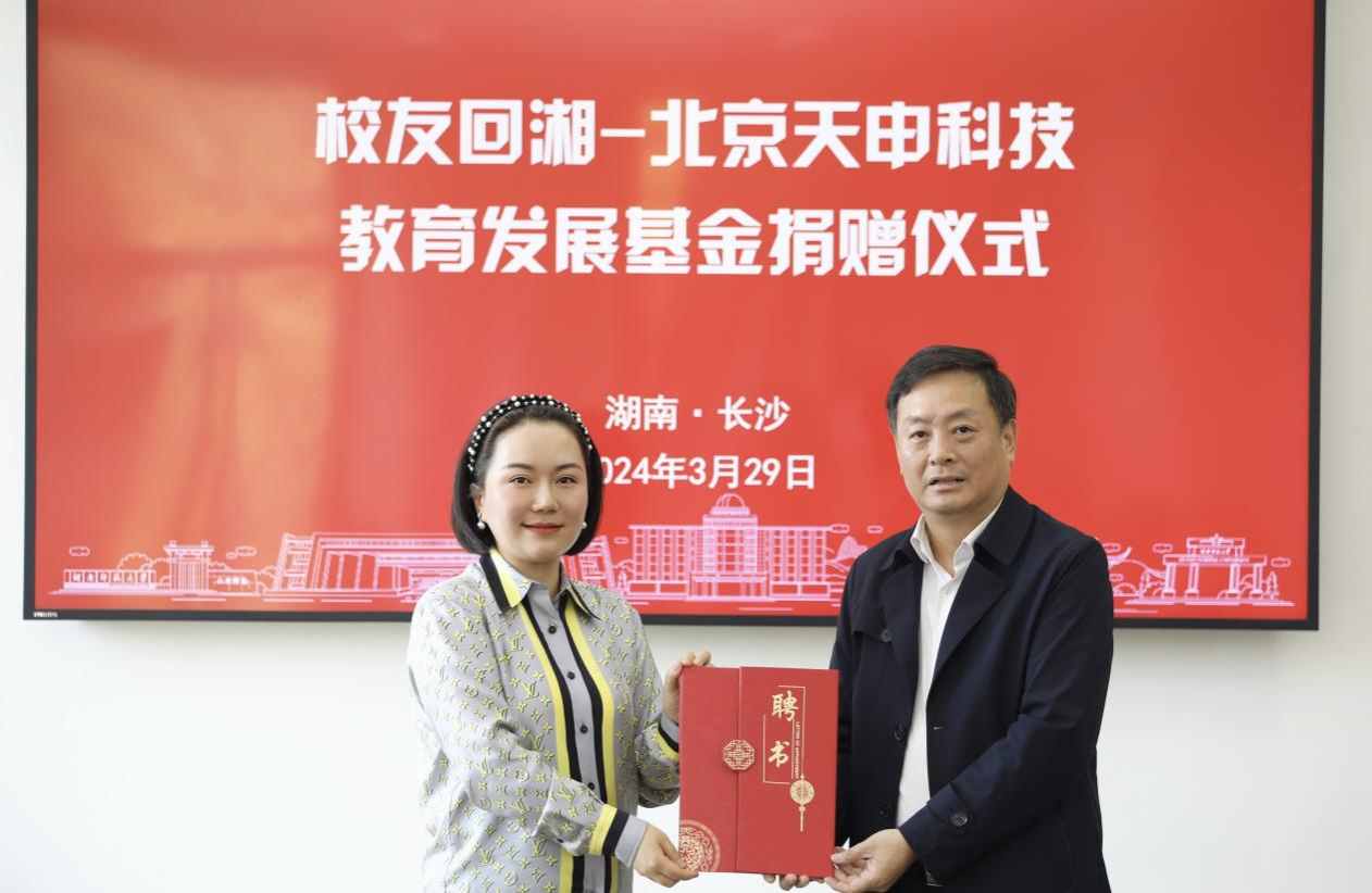 “北京天申科技教育发展基金”由北京天申科技有限公司出资捐赠,总额200万元,主要用于资助学业成绩优异的困境学生、奖励优秀学生干部和支持学校“校友回湘”专项工作等。