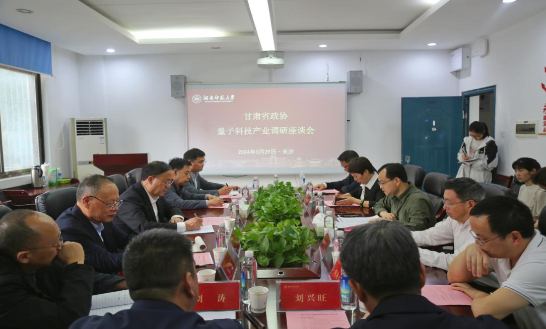 (记者 肖睿洋 洪鹤铭 胡欣睿)3月29日下午,甘肃省政协党组成员袁占亭带领调研组来我校走访调研量子科技产业发展情况,调研座谈会在量子楼309报告厅举行。湖南省政协经济科技委员会主任、分党组书记许石林,副校长潘安练陪同调研并出席座谈会。