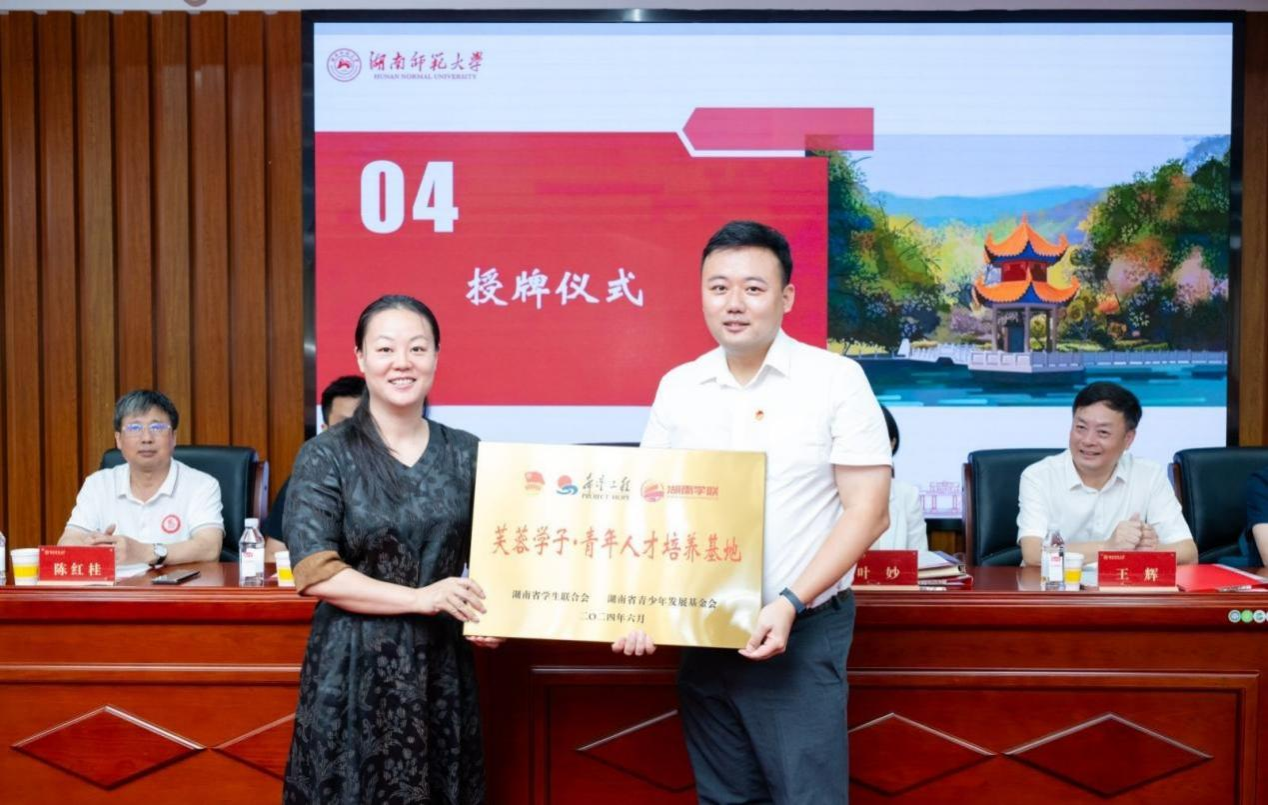 湖南省希望工程办公室主任、湖南省青少年发展基金会理事长谢小玲为我校授予“芙蓉学子·青年人才培养基地”牌,我校团委书记陈天嵩接牌。