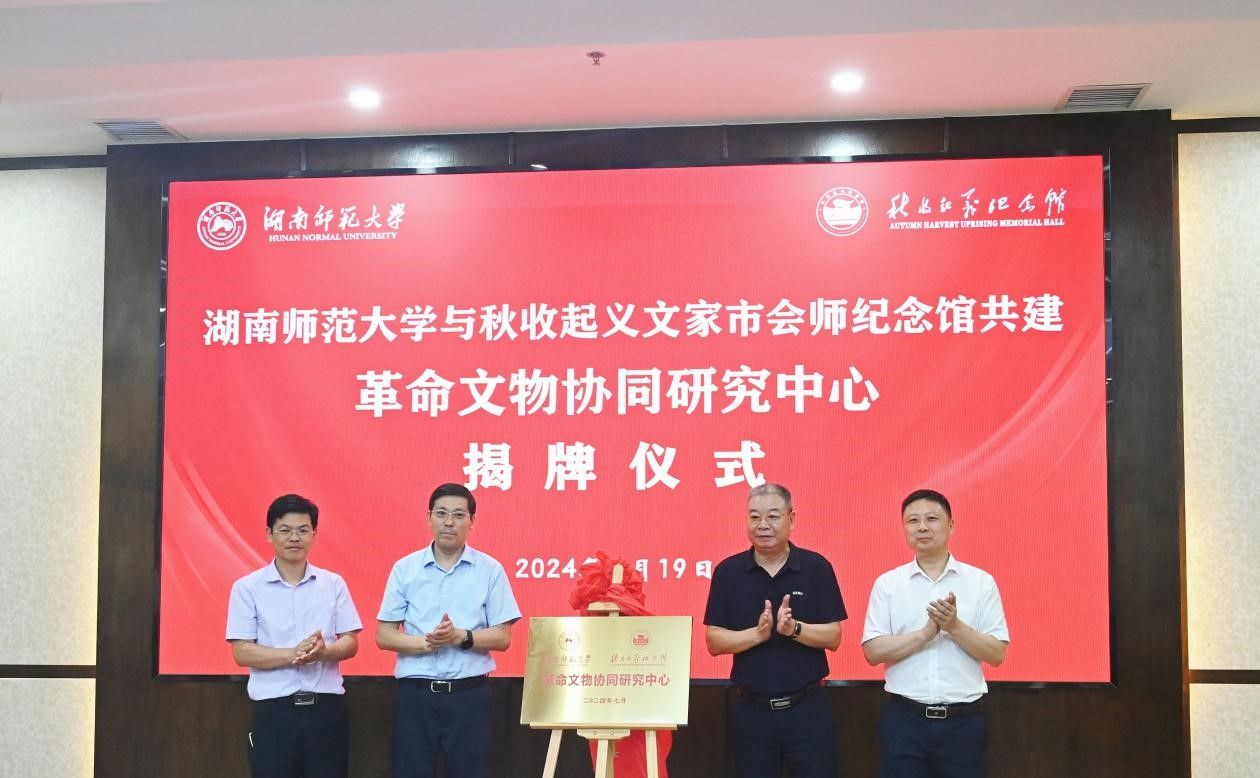 (供稿 历文院)7月19日上午,我校与秋收起义文家市会师纪念馆在浏阳举行签约仪式,合作共建革命文物协同研究中心。浏阳市委常委、宣传部部长李爱民,我校党委副书记周俊武出席揭牌仪式。仪式由秋收起义文家市会师纪念馆副馆长苏杨辉主持。