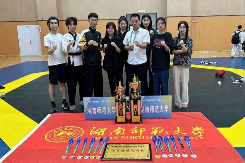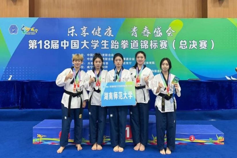 (供稿 体育学院)7月20日至26日,第十八届中国大学生跆拳道锦标赛(总决赛)在湖北咸宁成功举行。我校跆拳道队17名运动员在体育学院党委书记李波,教练员石华毕、汪明华的带领下,通过努力拼搏,取得了4金6银7铜,1项第四名、5项第五名,女子丙A组竞技团体总分第二名,男子丙A组竞技团体总分第五名的好成绩。