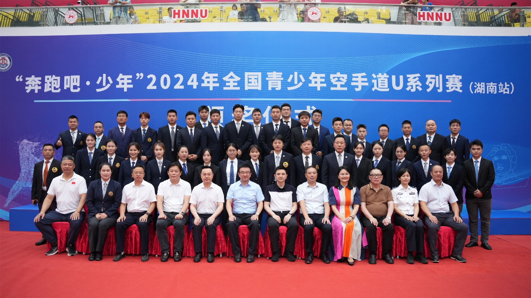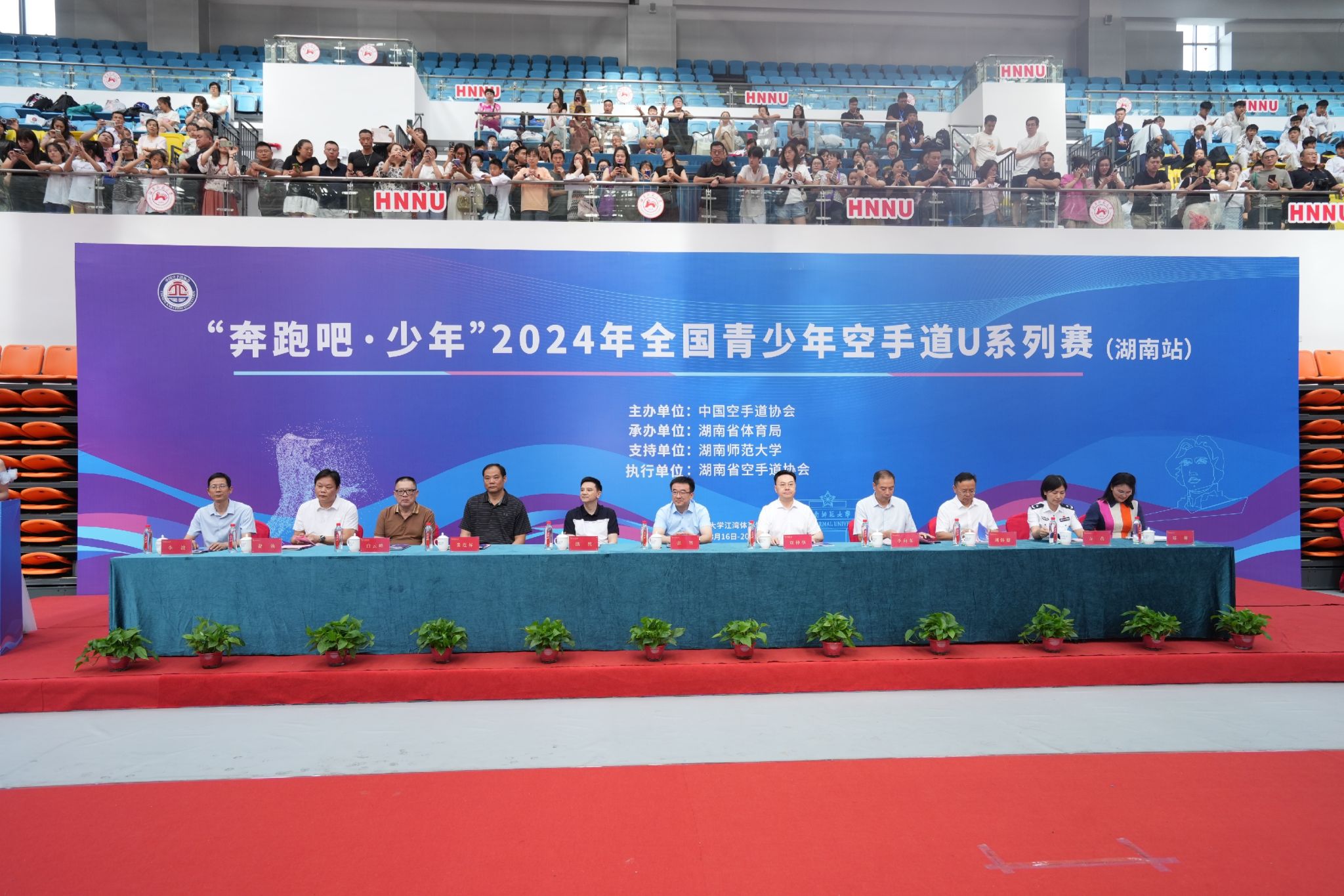 (供稿 体育学院 记者 胡欣睿 王卓雅)8月18日上午,“奔跑吧·少年”2024年全国青少年空手道U系列赛(湖南站)开幕式在我校江湾体育馆举行。国家体育总局拳跆中心党委书记、主任,中国空手道协会主席张智,湖南省体育局党组书记熊倪,中国空手道协会副主席李向东,湖南省体育局党组成员、副局长张连标,中共第二十届中央候补委员、中国工程院院士、我校校长刘仲华,副校长刘怀德出席开幕式。