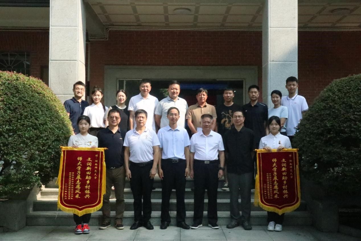 唐贤清对郭真明一行表示热烈欢迎,他详细介绍了我校暑期社会实践工作的具体情况,并肯定了暑期社会实践是引领青年学生投身基层建设、服务家乡发展、坚定理想信念、增长才学本领的重要举措,对省政协长期以来对学校乡村振兴和暑期社会实践工作的大力支持表示感谢。校地双方一同观看两支实践队暑期实践的精彩视频,湖南省政协办公厅接待办一级调研员、驻新田村工作队队长、第一书记段勇,湖南省政协办公厅离退办二级调研员、驻新田村工作队队员刘亚波结合视频做暑期社会实践总结汇报,分享心得体会。省政协办公厅乡村振兴工作队、新田村向我校赠送锦旗。