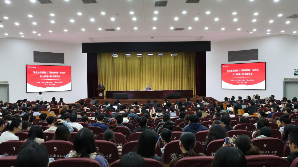 刘仲华以自身求学及工作经历为切入点,与同学们分享了有关深化教育科技人才体制机制一体改革的多重依据、时代意蕴、实践路途三个部分的深入思考。