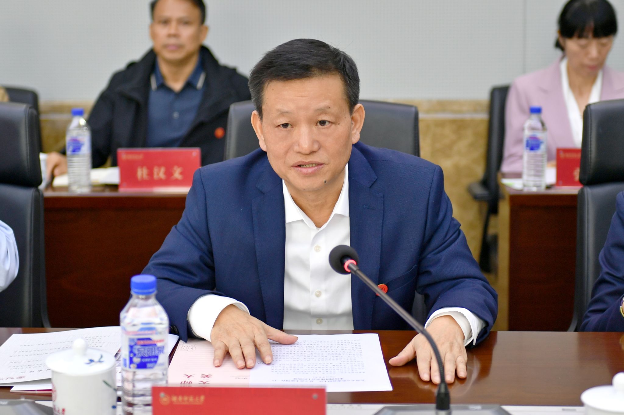 蒋洪新致欢迎辞。他代表学校向周农一行的到来表示热烈的欢迎,向省总工会一直以来对我校的关心和支持表示衷心的感谢。他从坚持党的领导、大力实施人才引进战略和建立大学共同体三方面阐述了我校办学治校的法宝。他强调,一流的大学必须有一流的人才,一流的人才才能培养出更优秀的学生,更优秀的学生才能让大学在世界各地展现一流的成就。近年来,在省领导的关心下,在湖南省总工会的支持下,我校不断夯实人才基础,从世界顶尖大学引进人才,统筹文、理、工、医、艺术类学科综合发展,十一个学科进入ESI全球前1%,被誉为世界大学里中国进步最快的大学之一,进步量居全国第二位。他表示,希望省总工会能够继续支持我校发展,学校将贯彻落实习近平总书记对教育的重要论述,不断改善办学条件,提升学科整体实力,提高人才培养质量,在推进中国式现代化建设中贡献师大力量。