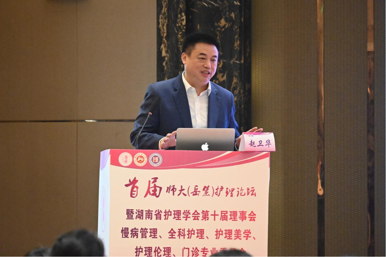 赵卫华对各位领导、嘉宾、专家学者的到来表示热烈的欢迎和诚挚的感谢。他指出,护理作为医疗卫生事业的重要组成部分,在医疗保健体系中扮演着重要的角色。护理人才培养对个人、医疗系统、社会乃至国家的发展都有着深远的影响。护理学院的成立是我校在医学教育领域的重要里程碑,为推动健康中国、健康湖南贡献了智慧和力量。
