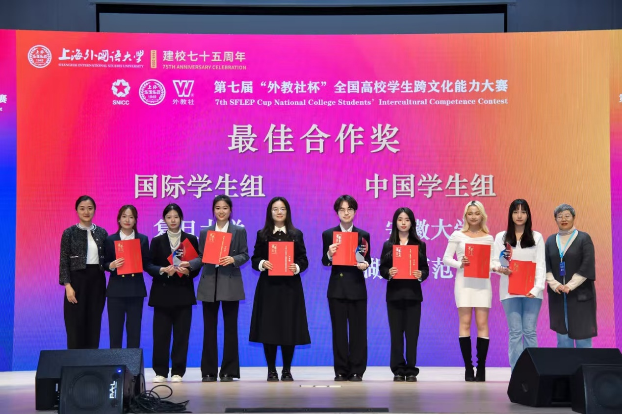 (供稿 外国语学院)11月28日至12月1日,第七届“外教社杯”全国高校学生跨文化能力大赛决赛、总决赛在上海外国语大学举办。在中国学生全国总决赛中,由李澧、李文佼指导的我校代表队邱立强、廖茂邱、谢思雨三位同学荣获全国特等奖,并在单项奖的角逐中获得最佳合作奖。