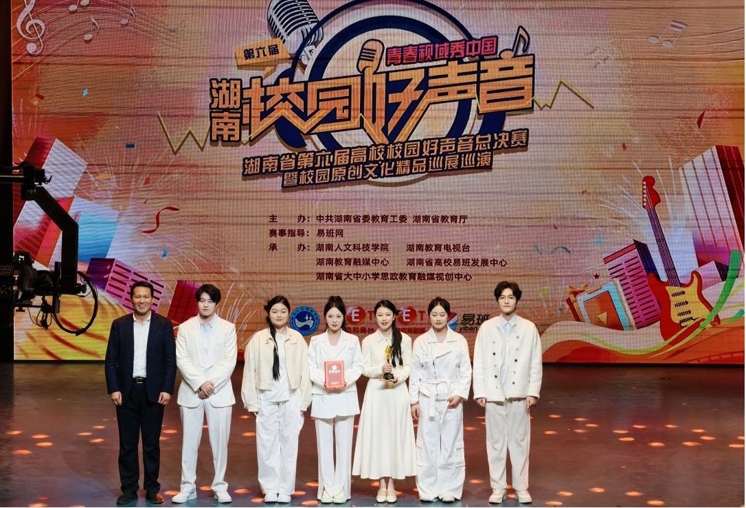 (供稿 学生工作部)12月30日,湖南省第六届高校“校园好声音”总决赛暨校园原创文化精品巡展巡演活动在湖南人文科技学院举行。我校代表队以总分第一名的成绩夺得总冠军(特等奖),中共湖南省委教育工委委员、湖南省教育厅党组成员余伟良为我校代表队颁奖。
