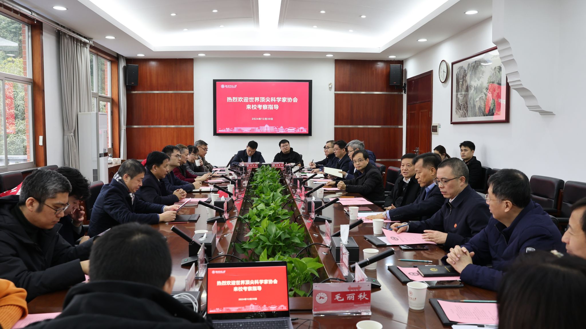(记者 黄依依 武晓露)12月30日下午,世界顶尖科学家协会来校考察,并在校办公楼二会议室举行座谈会。湖南省发展与改革委员会副主任蒋俊,世界顶尖科学家协会秘书长于利成,复旦大学复杂体系多尺度研究院教授、创始院长马剑鹏,上海交通大学转化医学院教授、点击创源孵化器主任董佳家,上海市产医融合战略委员会委员、上海未来产业生物制造专委会副主任委员肖桦,我校党委书记、欧洲科学院院士蒋洪新,副校长唐贤清、潘安练出席会议。