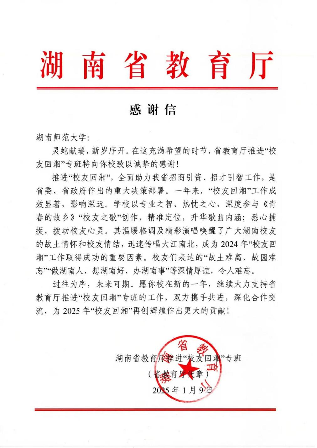 (供稿 校友总会)1月9日,教育厅“校友回湘”专班向我校发来一封感谢信函,对我校在创作“校友回湘”主题歌曲中所发挥的关键作用表示衷心的感谢。信函中特别强调,《青春的故乡》这一作品的成功创作及其广泛传播,已成为“校友回湘”工作取得成功的重要推动力。