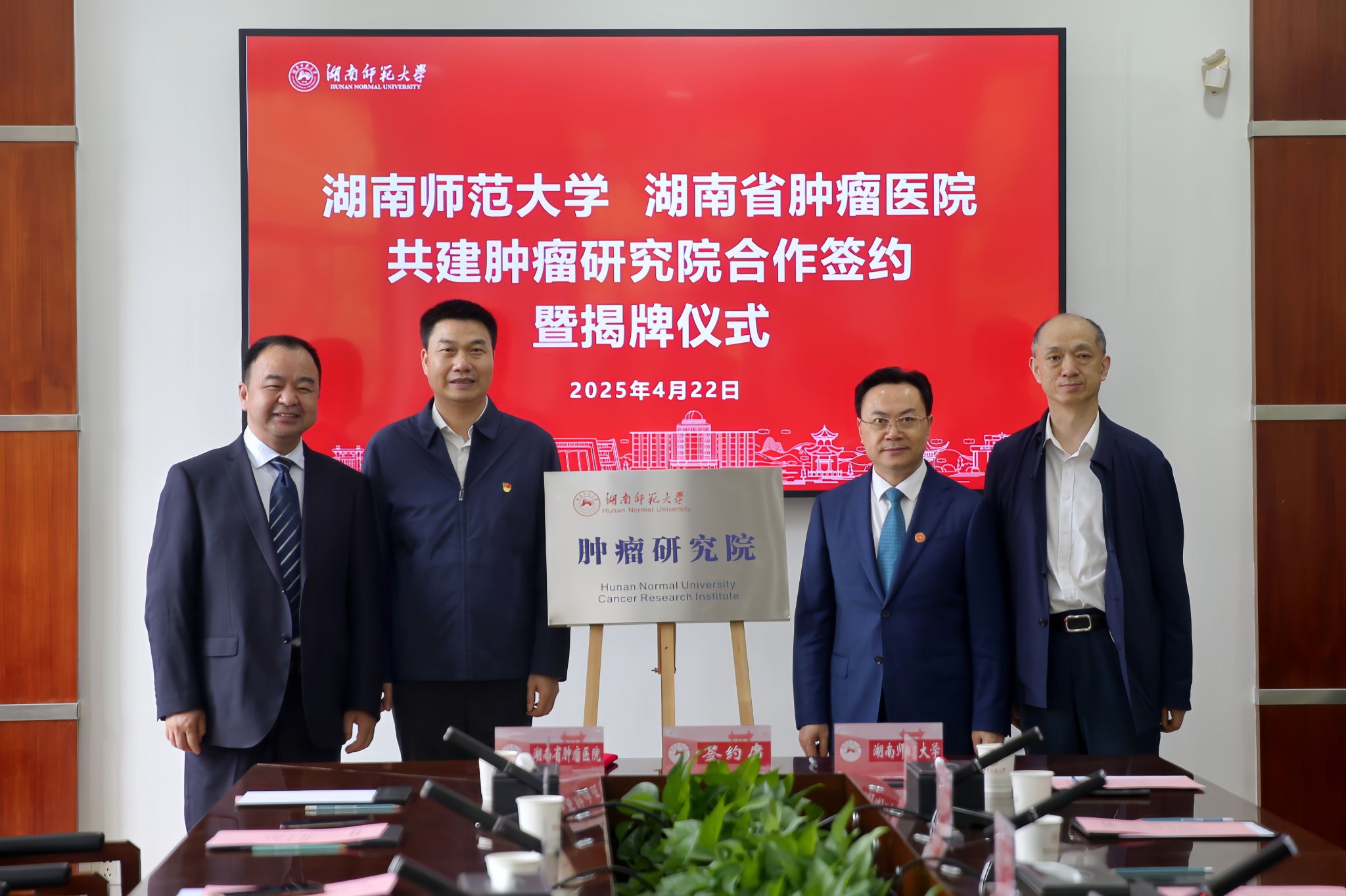 (记者 黄依依 向春玲)4月22日上午,我校与湖南省肿瘤医院共建“华亿体育登录肿瘤研究院”合作签约暨揭牌仪式在校办公楼二会议室举行。我校校长、中国工程院院士刘仲华,医学部党工委书记、主任祝益民,湖南省肿瘤医院党委书记蔡宏坤、院长向华出席仪式。仪式由副校长杨震主持。