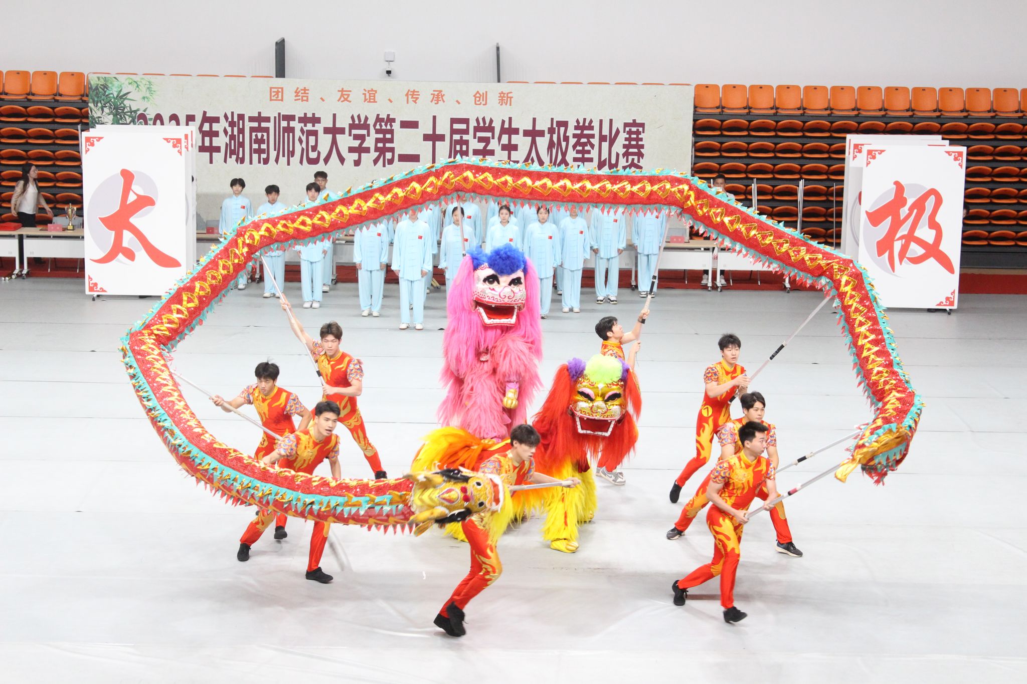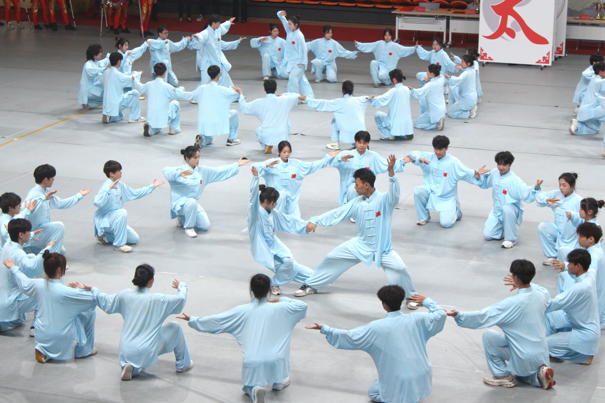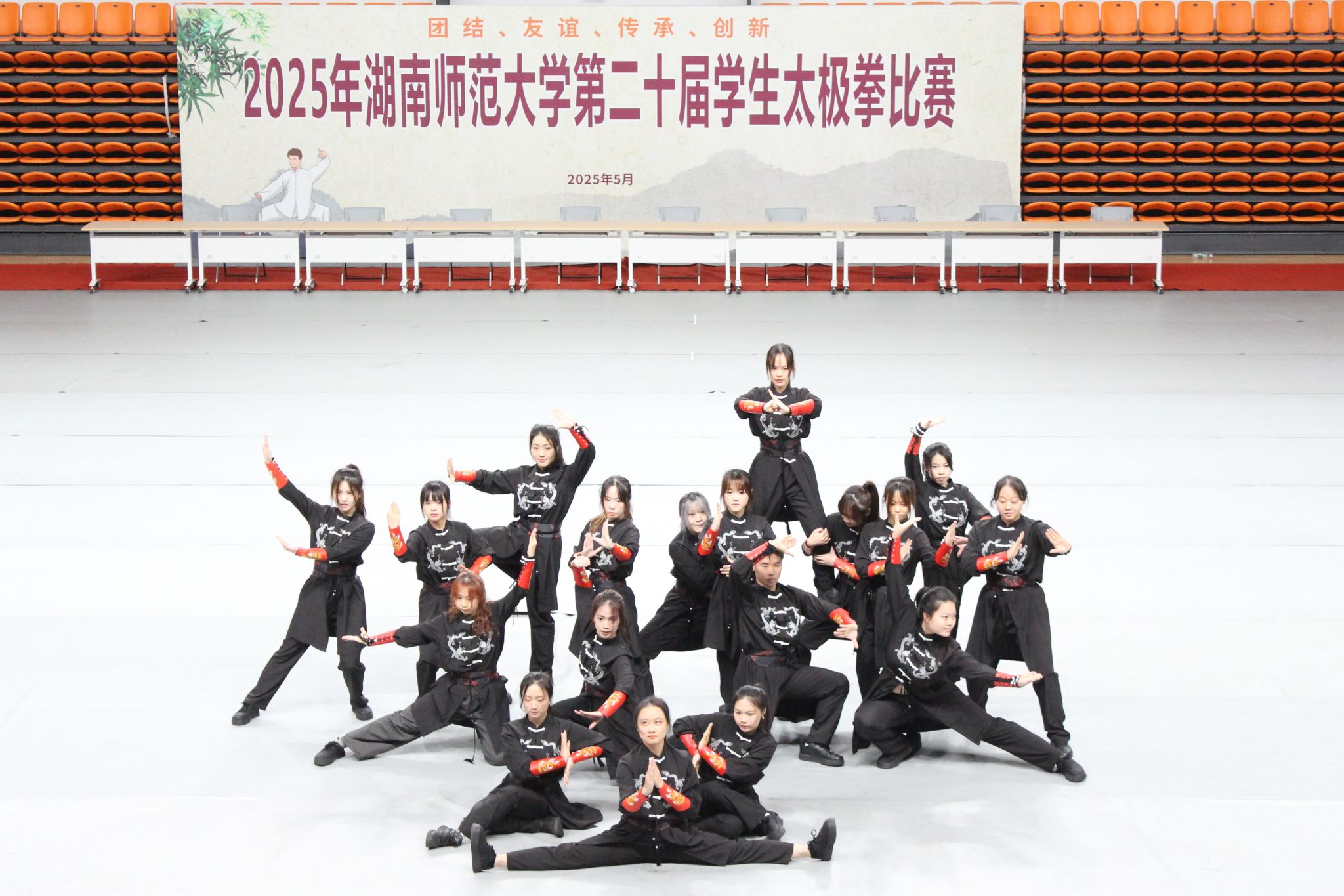 本次比赛共有23支队伍,两千余名学生参赛,分为团体赛、男子个人赛和女子个人赛。该赛事旨在提升学生身心素质,弘扬中华传统文化,促进校园体育文化建设。各参赛队选手们身着统一服饰,动作协调规范,行云流水,展现出我校学生刚柔并济的体魄和内外兼修的文化传承精神。