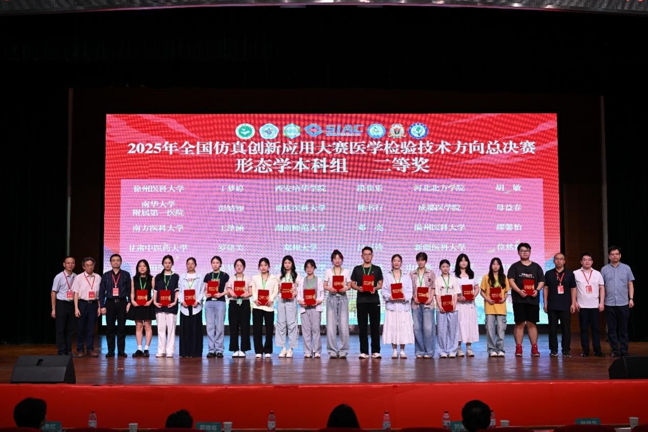 (通讯员 黄鸿剑)近日,2025年全国仿真创新应用大赛医学检验技术方向总决赛在陕西咸阳举办。我校医学部医学技术与转化学院本科生彭平平、邓亮在医学检验系教师团队的指导下分别斩获一等奖与二等奖。