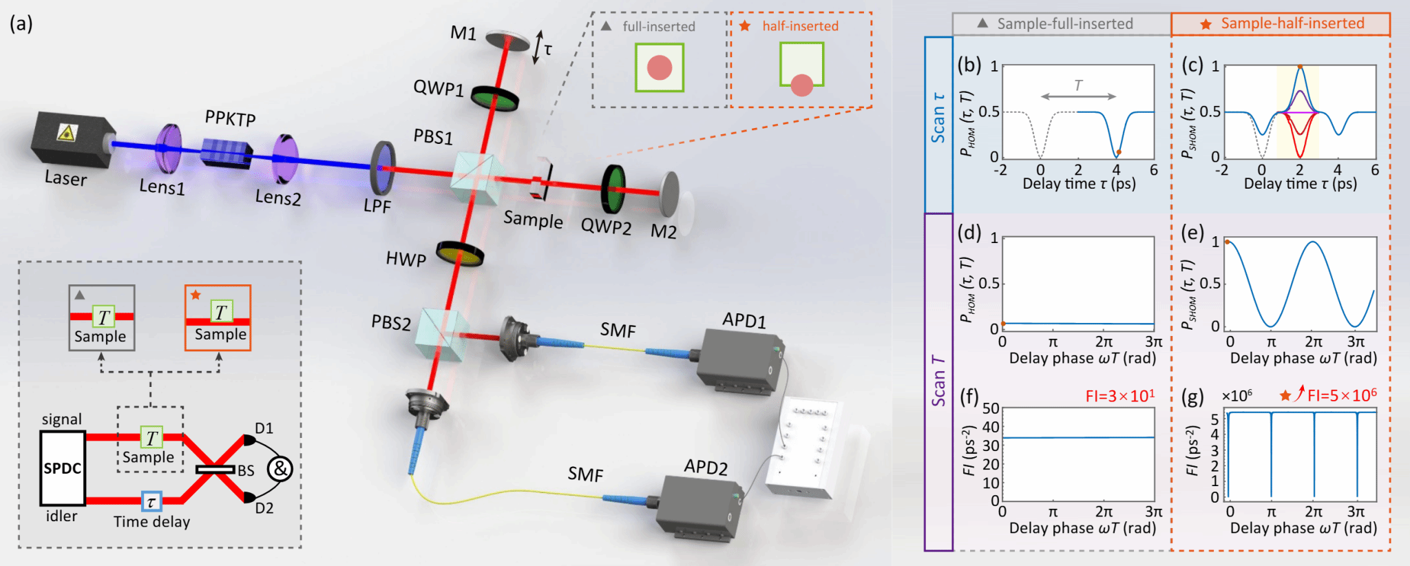 透明样品厚度测量是量子精密测量研究的重要课题。Hong-Ou-Mandel(HOM)干涉仪是量子光学中展示光子聚束效应的关键器件。传统的HOM干涉仪虽能实现纳米级厚度和阿秒级延迟时间的测量精度,但单次测量Fisher信息较小,需重复数万次才能达到阿秒精度,效率极低。