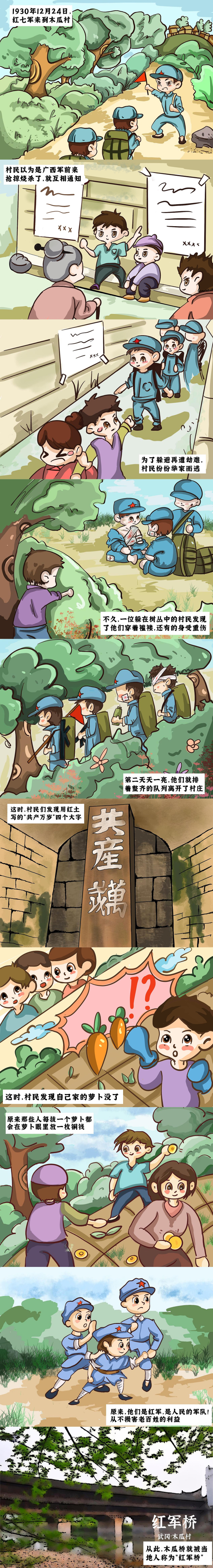 “湖南是一方红色热土,大批共产党人在这片热土谱写了感天动地的英雄壮歌。”在湖南考察期间,习近平总书记深情地说。为迎接中国共产党成立100周年,充分利用好红色资源,讲好红色故事,华亿体育登录“武萌冈冈好队”参与“策游潇湘‘营’出花YOUNG”比赛期间,走进湖南省邵阳市武冈市木瓜村红军桥,了解一个发生在湘西南古城武冈的真实事件《萝卜眼里长铜钱》,并创新讲述方式,以手绘漫画形式讲好红色故事。