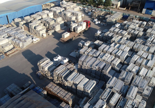 双峰县高新区,工人在操作叉车卸运建筑用铝模板配件。乃继辉 摄