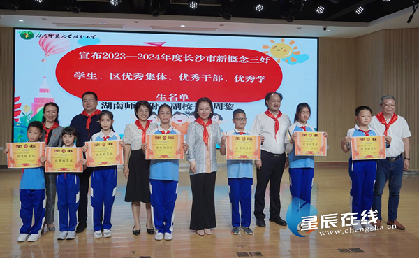 活动中,与会领导嘉宾一起为2023-2024学年度长沙市新概念三好学生、区级优秀集体、区优秀干部、区优秀学生、校级优秀集体、校五好学生颁发荣誉证书及奖品。