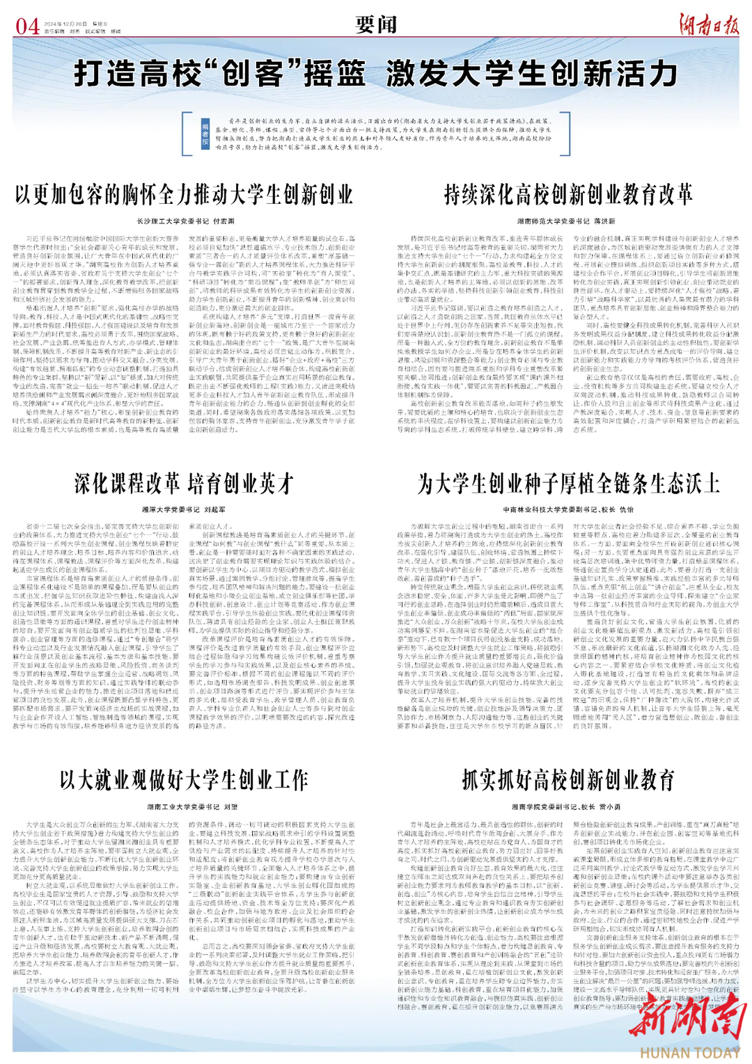 持续深化高校创新创业教育改革,推进青年群体成长发展,是习近平总书记对高等教育的重要关切。湖南省大力推进支持大学生创业“七个一”行动,力求构建起全方位支持大学生创新创业的制度框架。高校是教育、科技、人才的集中交汇点,既是基础研究的主力军、重大科技突破的策源地,也是创新人才培养的主阵地,必须以创新的思维、改革的办法、务实的举措,坚持科技创新引领创业教育,科技创业带动高质量就业。