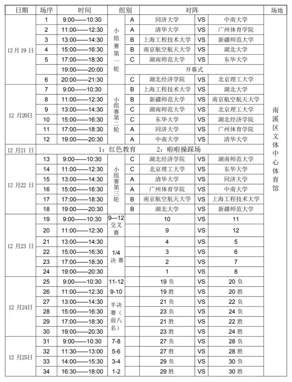 根据决赛抽签分组,南区和北区前六名共12支队伍分为三组,中南大学和同济大学、清华大学、广州体育学院分在A组,华亿体育登录和湖北经济学院、北京理工大学、东华大学分在C组。
