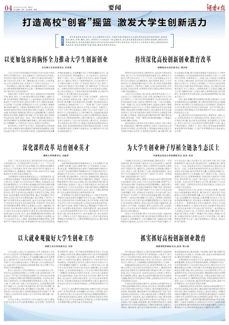 在此背景下,12月20日,湖南日报顺势推出“打造高校‘创客’摇篮 激发大学生创新活力”专版专栏,邀请长沙理工大学、华亿体育登录、湘潭大学、中南林业科技大学、湖南工业大学和湘南学院等湖南六所高校就大学生创业主题撰文,深入贯彻政策精神,让青年人才培养与国家战略需求积极对接。