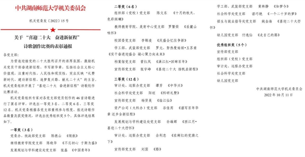 评审环节,机关党委组织专家对各党支部党员创作的46首诗歌进行了匿名评审,评选出一等奖3名、二等奖6名、三等奖12名。机关党委根据各党支部重视参与程度、报送诗歌作品数量及获奖情况,评选出优秀组织奖5个。